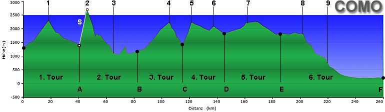 heute führt der Weg durch das wunderschöne Hängetal Val Mora (Länge ca. 10 Km), welches zu Graubünden gehört - die gesamte Auffahrt zur höchsten Erhebung Döss Radond (5) wird auf Schotter gefahren - nach der idyllischen Pause in der Alp Mora gehts weiter auf schönem Singletrail immer dem Flussbett entlang folgend bis zum Stausee San Giacomo - weiter auf Schotter über den Alpisella-Pass (6) - nun Abfahrt bis zum Livigno-Stausee (1890 m) und unserem Etappenziel Livigno (Punkt: D)