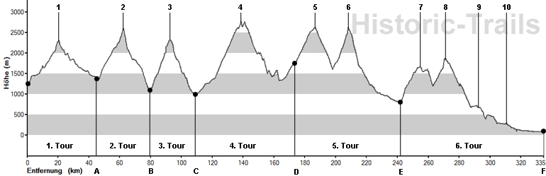 längere Auffahrt auf abgelegener Asphaltstraße nach der 1. Passhöhe gehts auf schönen Panorama-Singletrail weiter bis zum Schützengraben am Pso. Forcola (4) nach folgender Schotter-Querfahrt gehts eeeewig leicht fallend runter auf einem der spektakulärsten Militär-Singletrails aus 1. Weltkrieg bis zum idyllischen Cancanosee/hier Pause weiter auf Schotter nach Bormio abschließend Asphaltauffahrt nach S. Caterina (D)